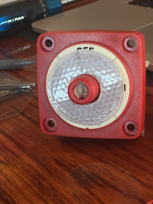 Of course it wasn't. Bill quickly sussed out the problem; the emergency over-ride switch to cut all of the DC power (house batteries), failed. [It was like somone turned it off, but no one had...] He disconnected the over-ride, and all was well in boat world. But we haven't had this piece of safety gear connected for quite awhile, and now it's time to replace it.